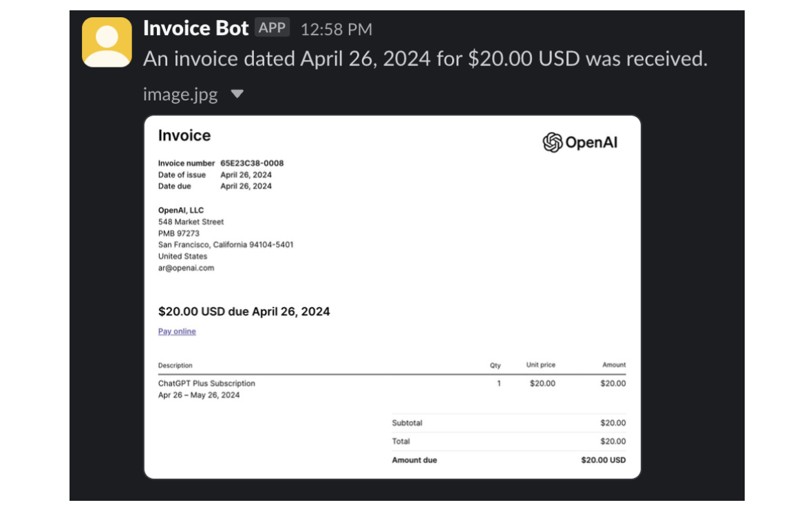 - Notification systems: Trigger alerts (e.g. send a Slack message) when a new invoice arrives, summarizing key details.