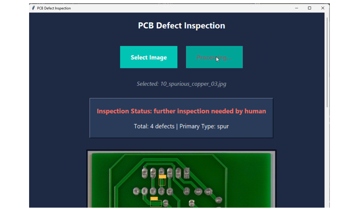 This project builds a real-time inspection system that uses computer vision to detect various types of defects on printed circuit boards (PCBs) such as open circuits, missing holes, short circuits, spurious copper, and other anomalies and classify whether a PCB passes or needs human review.