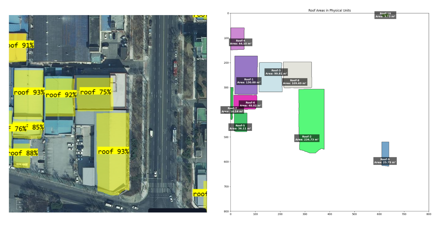 This project uses computer vision to automatically detect roof areas from aerial or drone images, derive the polygon boundaries of each roof, and then compute the real-world surface area of the rooftop. The goal is to estimate how much space is available for solar panel installation.