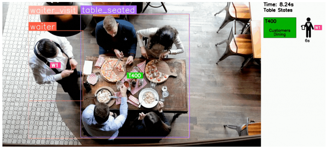 Fine dining establishments can benefit greatly from computer vision systems that can track the full lifecycle of a dining experience. For example, with overhead cameras monitoring tables and surrounding zones, using bounding box detection and zone occupancy, business owners can identify key milestones such as: customers being seated, menus being opened or closed, orders being taken, patrons leaving, and tables being reset.
