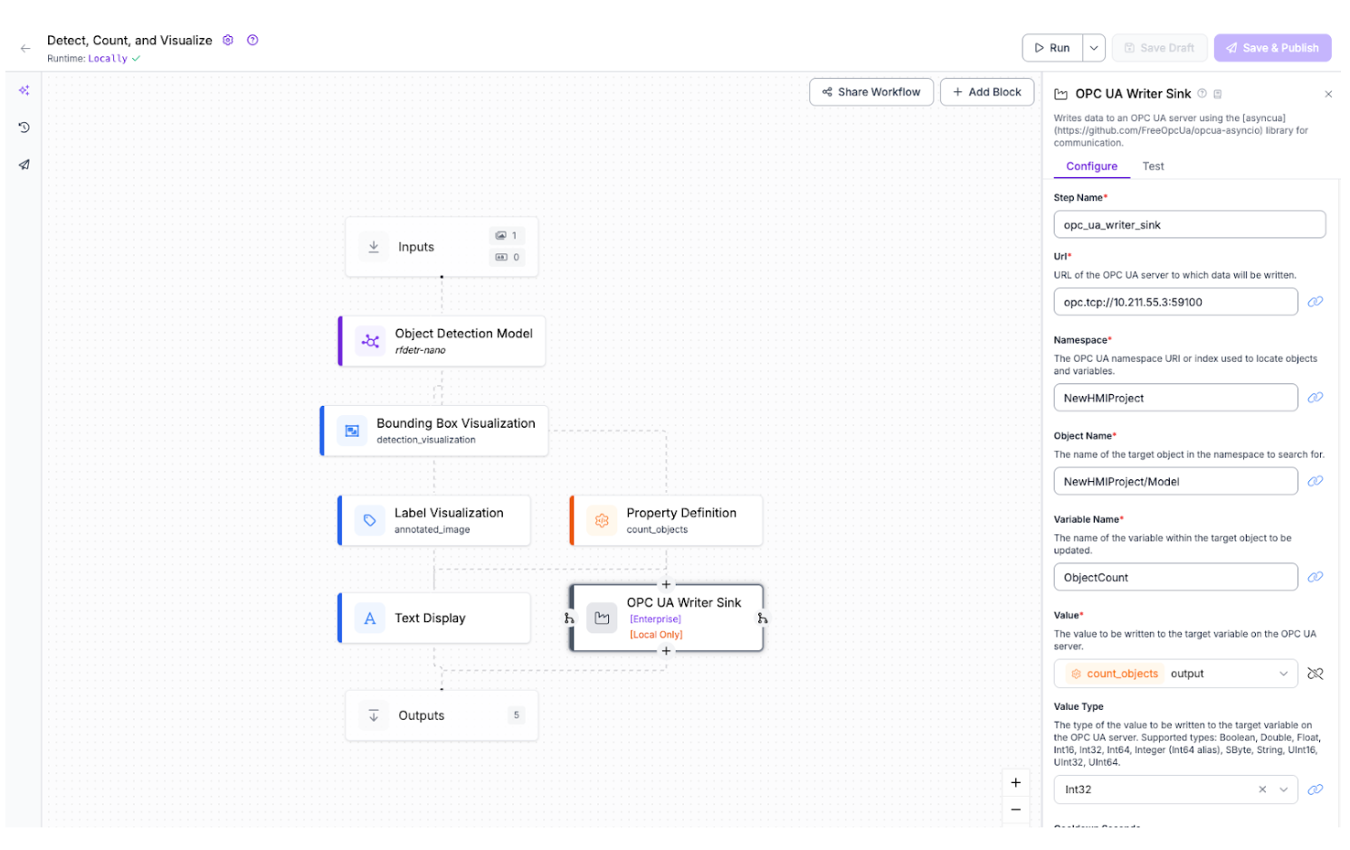 This guide shows you a simple way to connect Roboflow to FactoryTalk Optix. We will use a block called OPC UA Writer Sink. In just a few steps, you can show live data, like a count of objects, right on your screen.