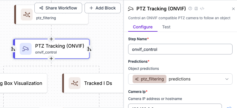 Within the workflow, even though they’re similar, the ONVIF setup is separate from the RTSP stream. The ONVIF settings are entered into the workflow block, and the block makes the assumption that the images injected into the block are from the camera being controlled.