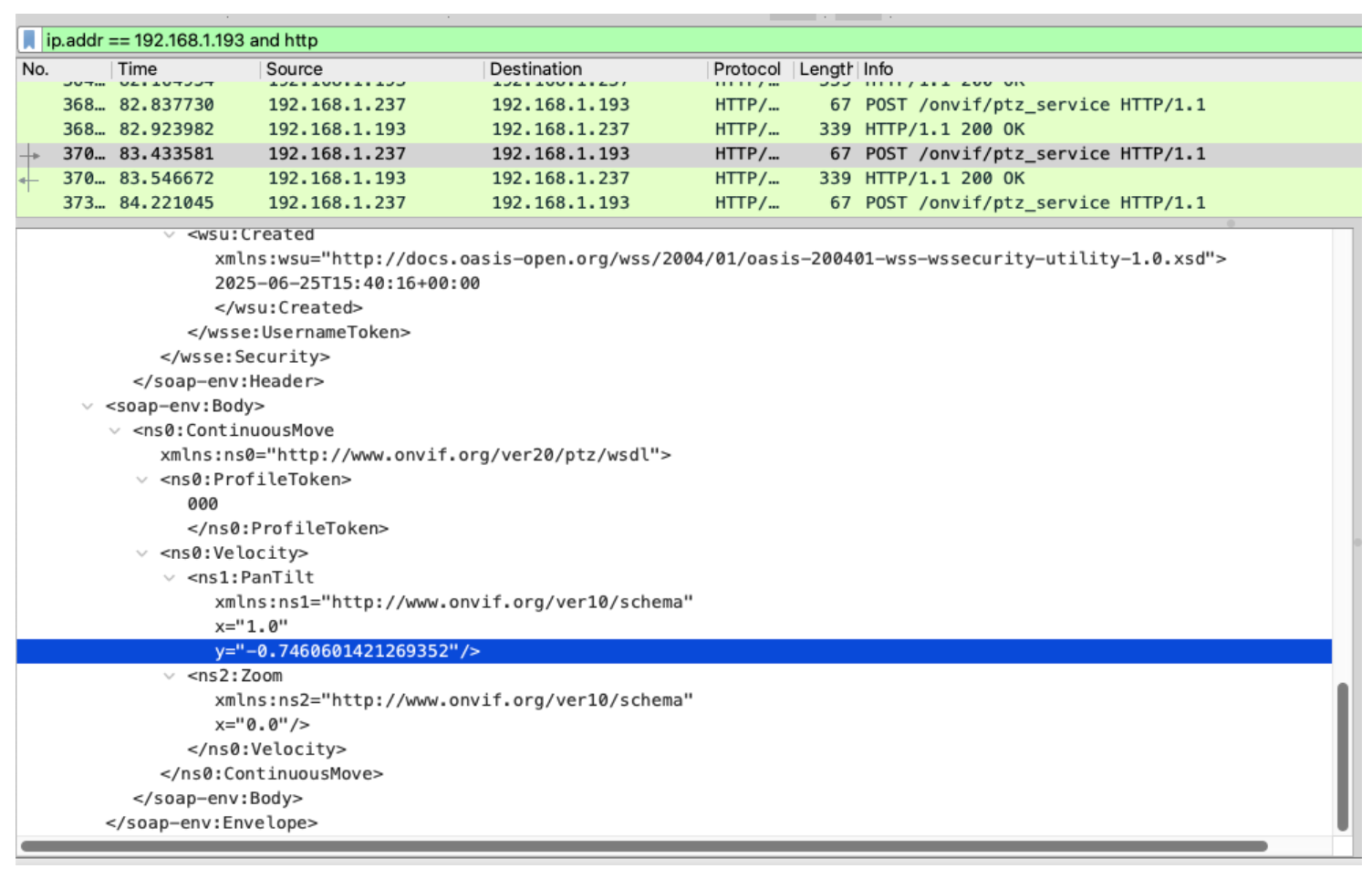 Wireshark is a great tool for viewing ONVIF payloads and inspecting specific movement commands.