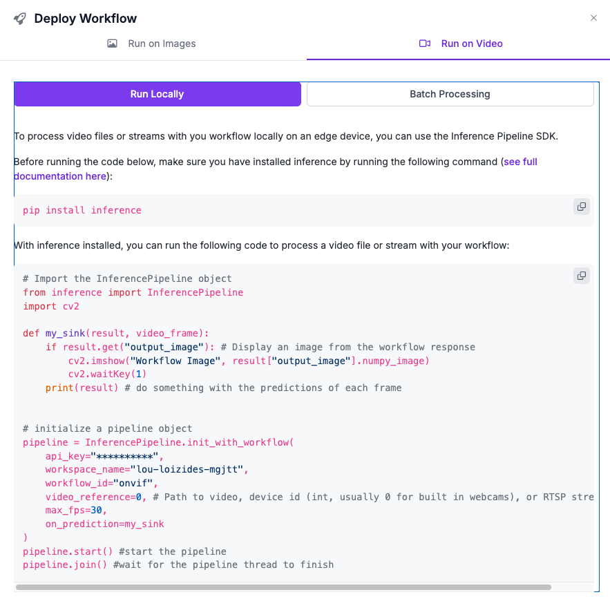 The boiler plate code provided by the workflow is the best starting point for running the workflow in inference. Inference pipeline should be used as the block is meant for video.