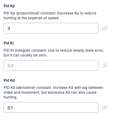 - Adjust Kp until the camera movement doesn’t significantly overshoot the object it’s tracking. To some degree, Kp is basically the speed control.
