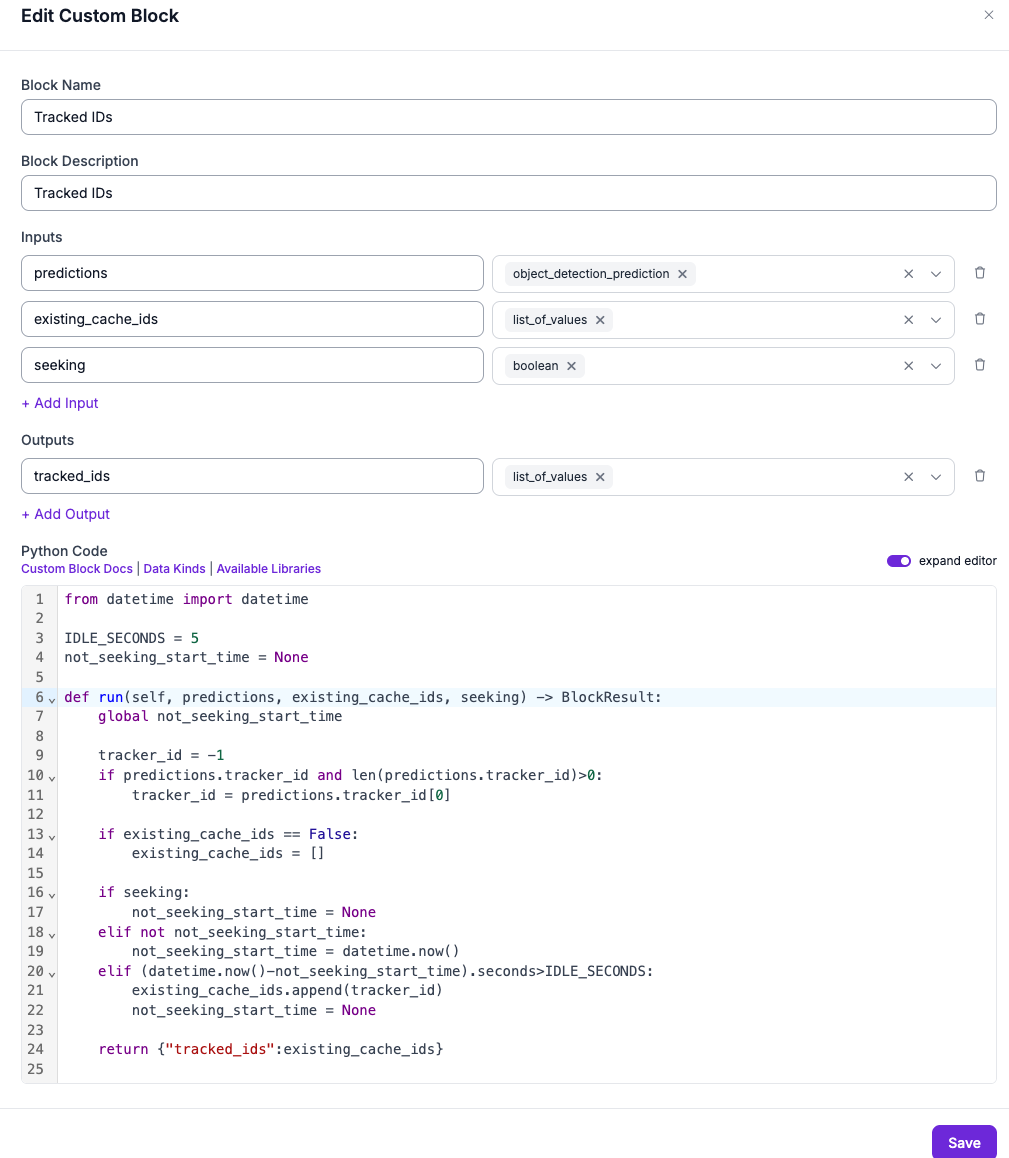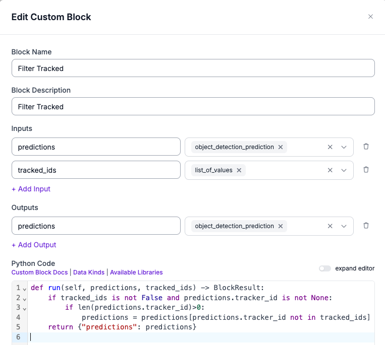 def run(self, predictions, tracked_ids) -> BlockResult: if isinstance(tracked_ids,list) and isinstance(predictions.tracker_id,np.ndarray): if len(predictions.tracker_id)>0: predictions = predictions[predictions.tracker_id not in tracked_ids] return {"predictions": predictions}