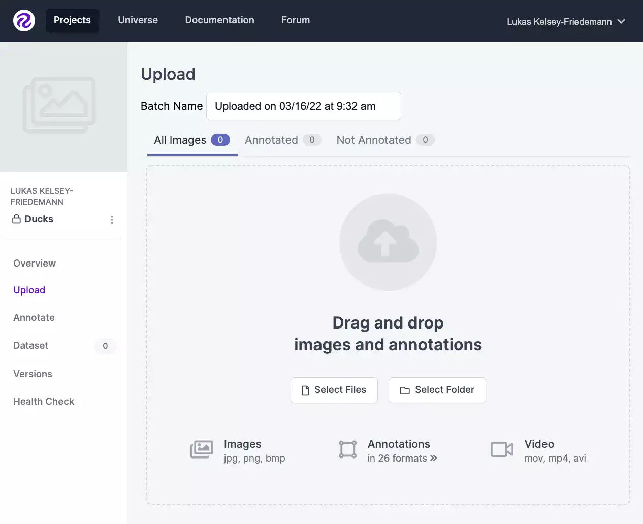 After creating a new workspace, drag & drop or select the folder containing your dataset in the annotation page on your project's page
