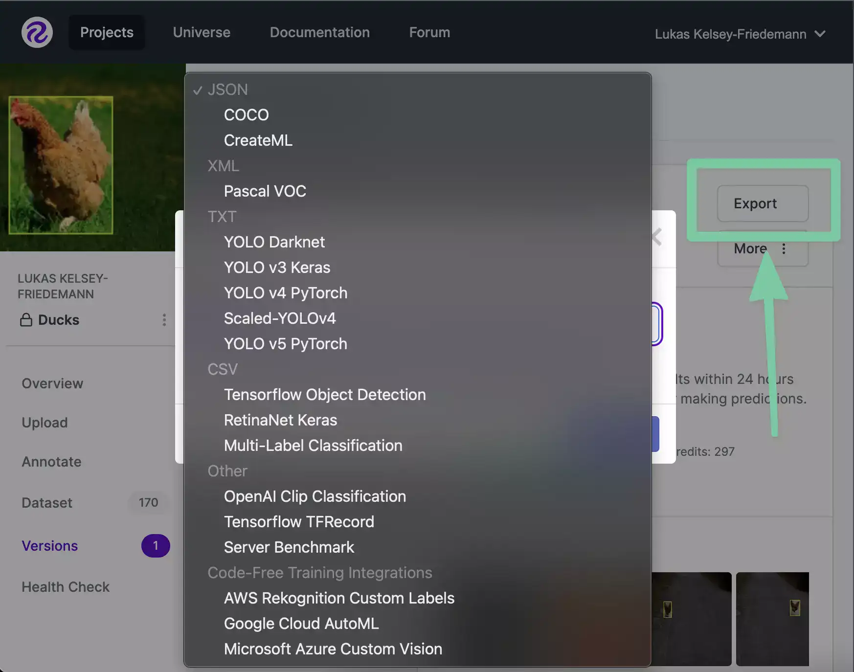 Generate a new version of your dataset (or select a pre-existing version) and then click Export. You'll be prompted to choose from the 26 annotation formats available.