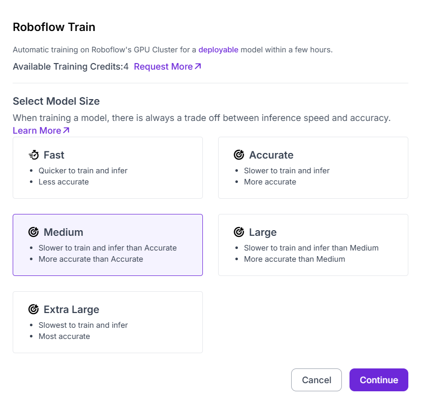 Next, you choose the model size, which controls the trade-off between inference speed and accuracy. The options range from Fast (quick training, lower accuracy) to Extra Large (slowest training, highest accuracy). To balance training efficiency with reliable predictions, I selected the Medium size, which offers improved accuracy compared to smaller models while keeping training and inference times manageable.