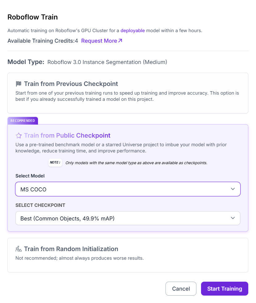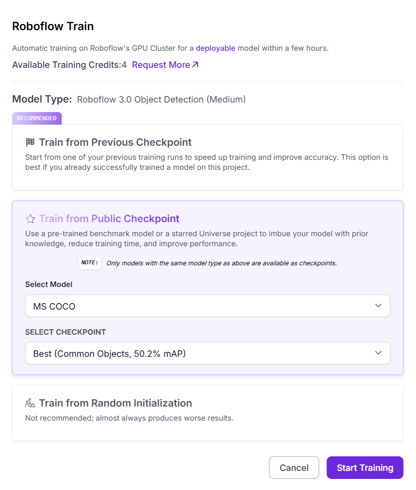 - Train from Public Checkpoint: start from a benchmark model like MS COCO, which gives the model pre-trained knowledge of general shapes and textures.