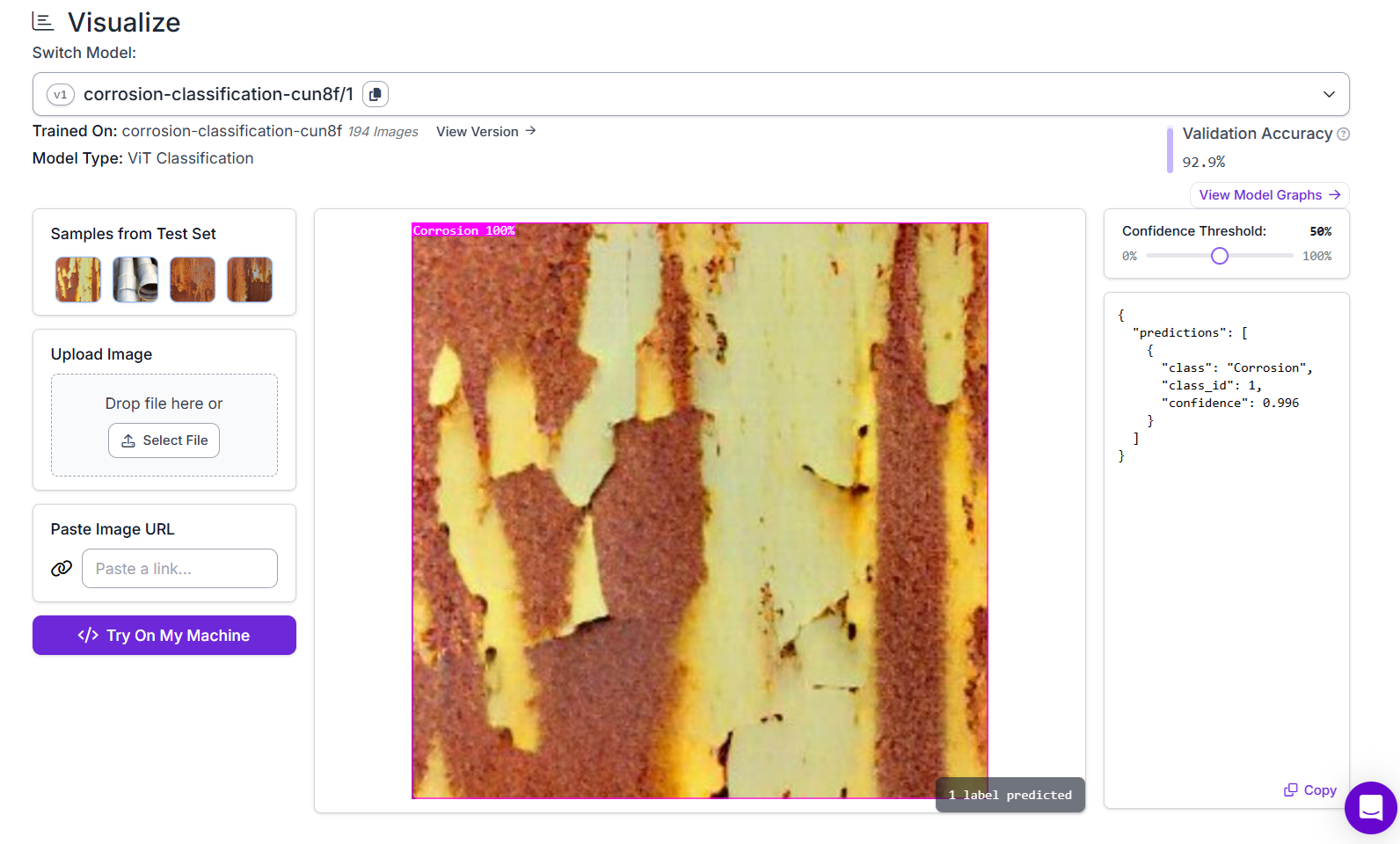 The result looks like following. The purple mask is displayed outlining the corroded region, and the JSON listing the polygon coordinates (x, y pairs) along with the class name and confidence.