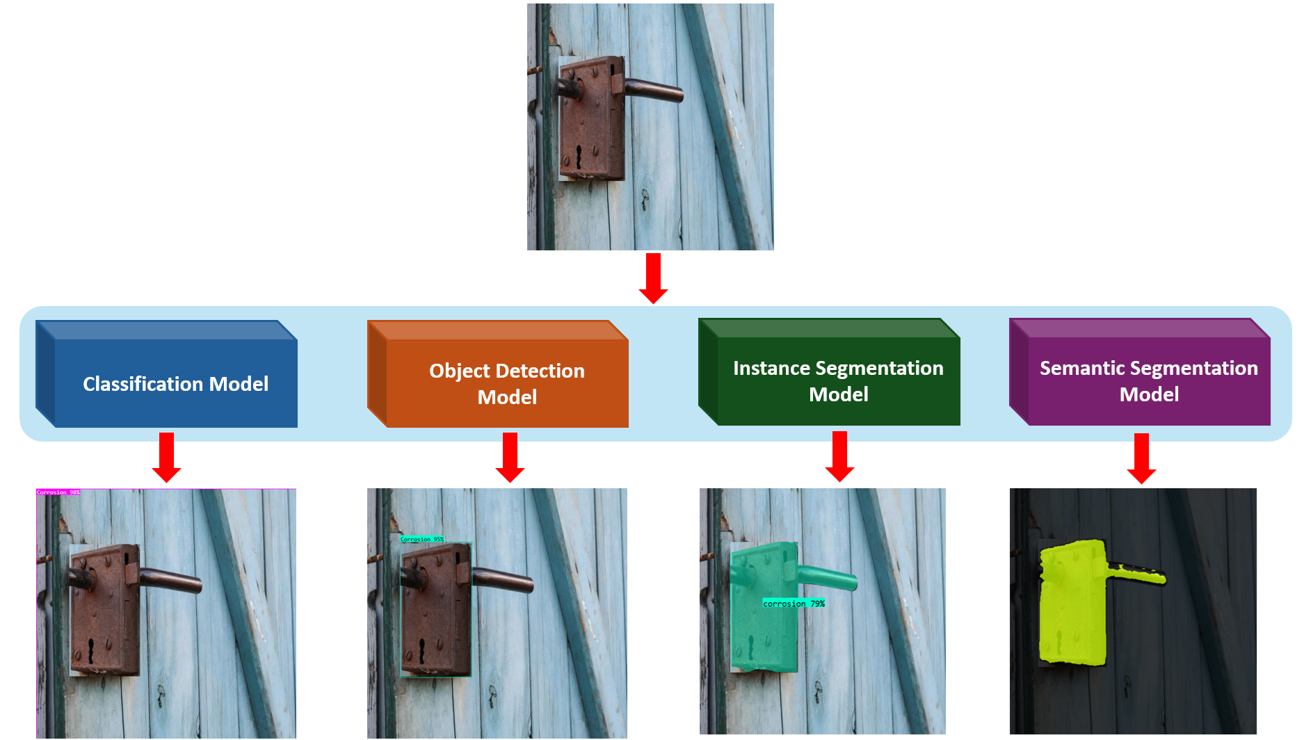 Modern approaches use deep learning models, like classification, object detection, and segmentation to not only detect the presence of corrosion, but also locate affected areas, measure their extent, and monitor progression over time. This makes inspections faster, safer, and more objective, while enabling continuous monitoring of large or hard-to-reach structures such as bridges, pipelines, ships, and aircraft. Following are the three main computer vision techniques for corrosion detection: