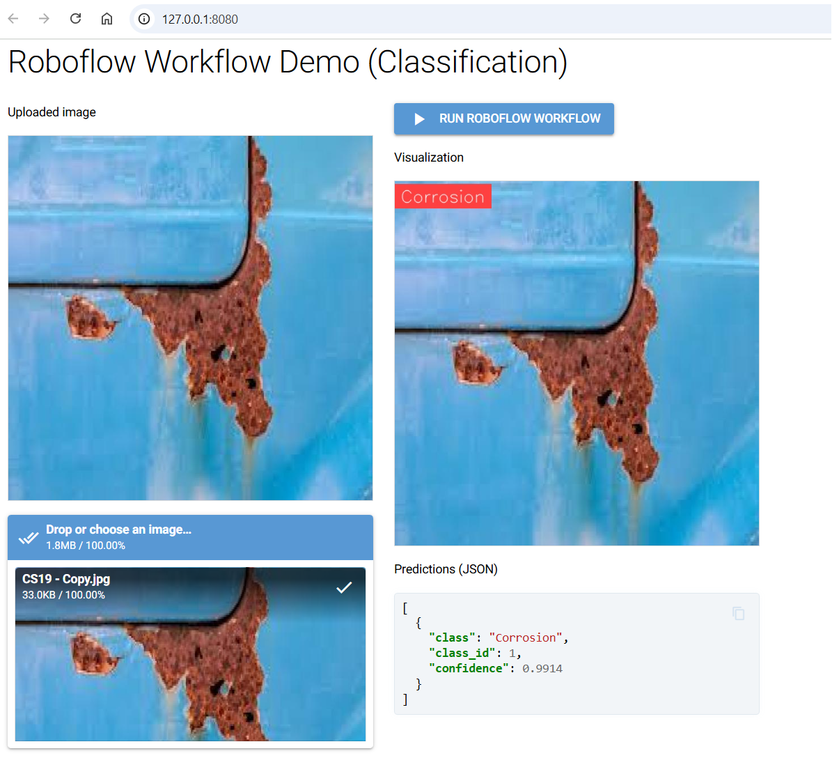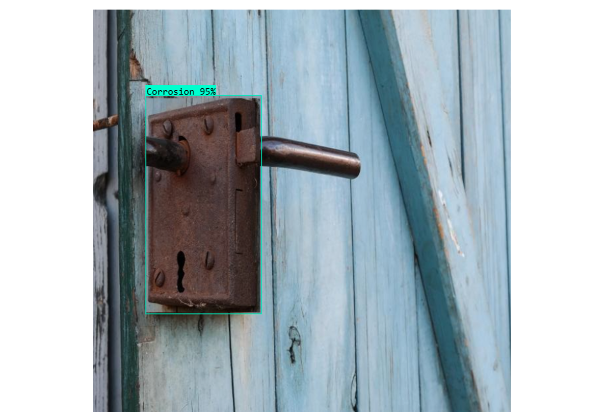 The workflow takes an image, detects corrosion patches with bounding boxes, displays them with labels, and also provides precise numerical prediction data for further use. The code below handles this deployment.