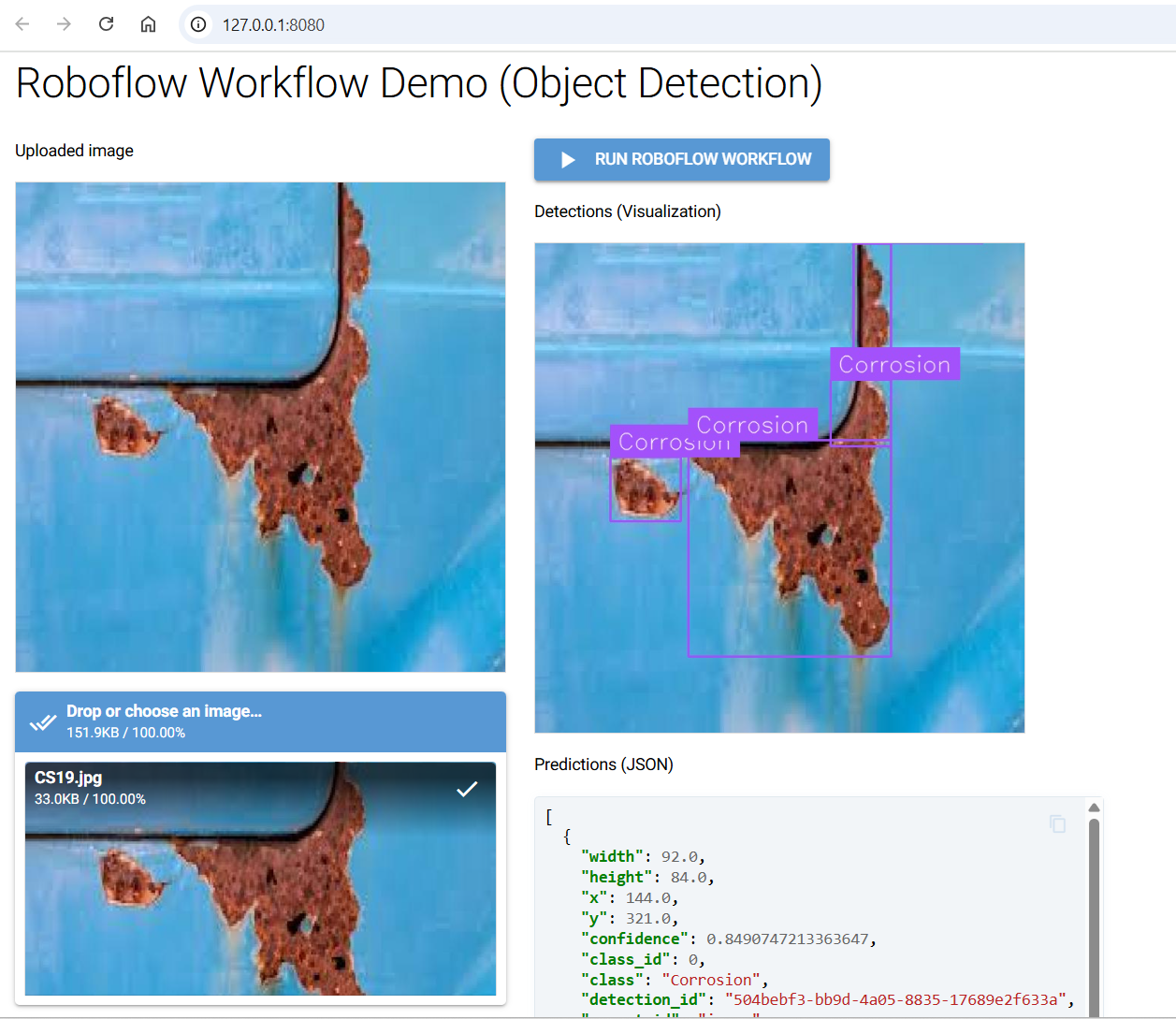 Clicking Run Roboflow Workflow sends the image to the detection workflow on Roboflow’s serverless endpoint. The model’s response includes bounding box coordinates (x, y, width, height) along with the predicted class label (in this case, “corrosion”) and a confidence score. The app extracts and displays the visualization image with bounding boxes on the right, and also prints the raw structured predictions as JSON below for further inspection.