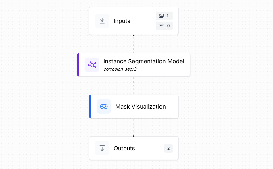 - Inputs: This block defines the incoming data to the workflow. In this case, the input is an image of a surface that may contain visible corrosion patches.