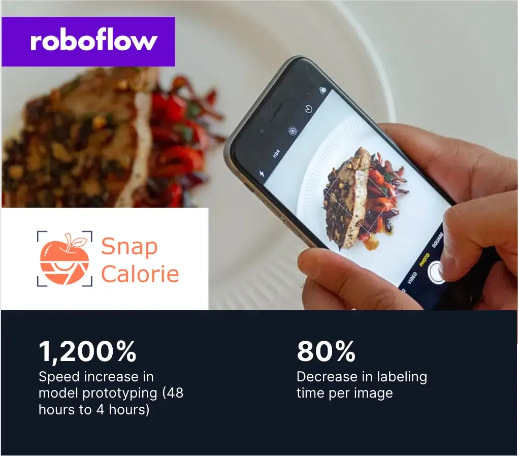 Through their use of Roboflow, SnapCalorie was able to increase their speed for model prototyping by 1200% and decrease the labeling time per image by 80%.