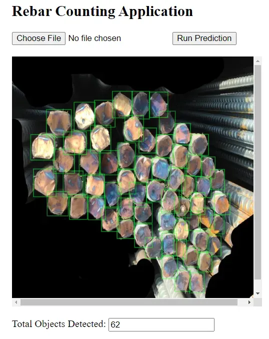 We will now build the following interface which will allow users to browse and upload the captured image and then run prediction to detect and count rebar in the image.