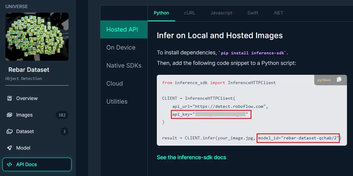 To build the application, we will use Roboflow hosted API in our PHP application. First, we need to obtain the required information such as Model ID and API key which can be done by accessing the API Docs link on the project page.