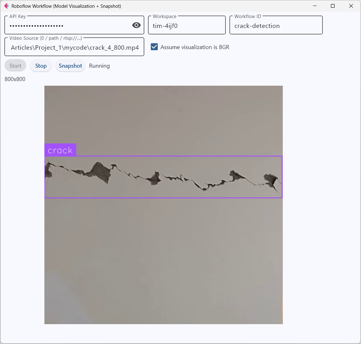 In this step, the trained crack detection workflow is deployed using a Flet app. The app connects to the Roboflow Workflow API and streams predictions from a camera feed or video source. For every frame, the app shows detection results with bounding boxes and labels drawn on the image. The interface includes controls to start/stop the pipeline, monitor the status, and capture snapshots of detected cracks for later review. This setup makes it possible to run real-time crack inspection from a simple desktop or web interface.