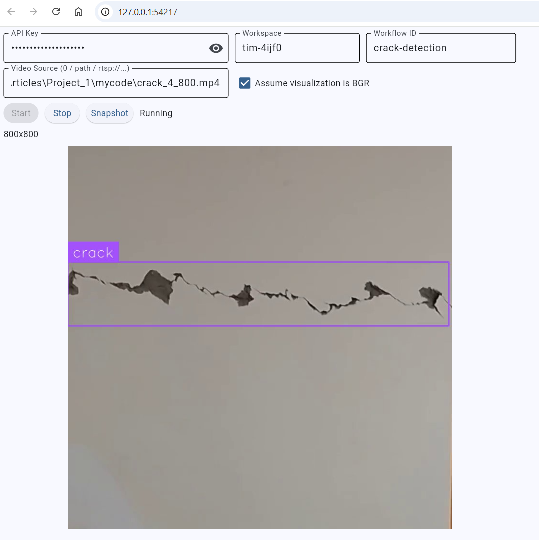 - Interface controls: Text fields let you enter your API key, workspace, workflow ID, and video source (camera, file path, or RTSP stream). Buttons allow you to start, stop, and take snapshots.