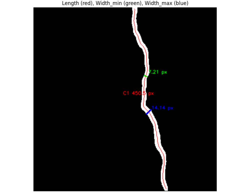 Finally, the code overlays these measurements back onto the image for visual confirmation: the skeleton is drawn in red, the narrowest width line in green, and the widest width line in blue. At the same time, all measurements are saved into CSV and JSON reports, providing both visual and numerical outputs.
