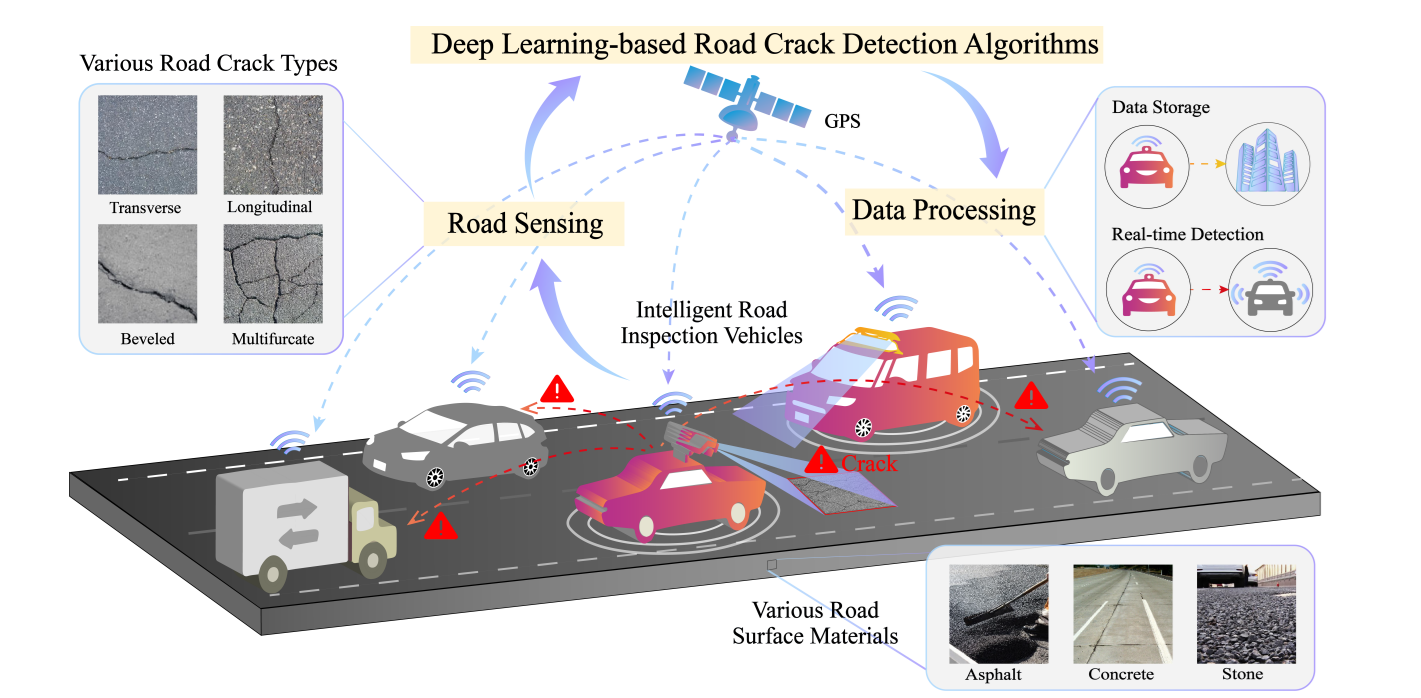 For example, in the paper Vehicular Road Crack Detection with Deep Learning, a road-mounted vehicular vision system is proposed where cameras capture pavement surfaces in real time as vehicles move.