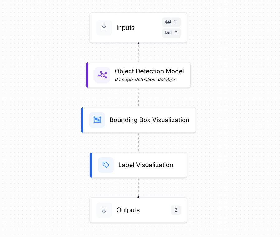 - Inputs: Defines the incoming data to the workflow. In this case, the input is an image of a surface (e.g., concrete, pavement, tile) that may contain visible cracks.