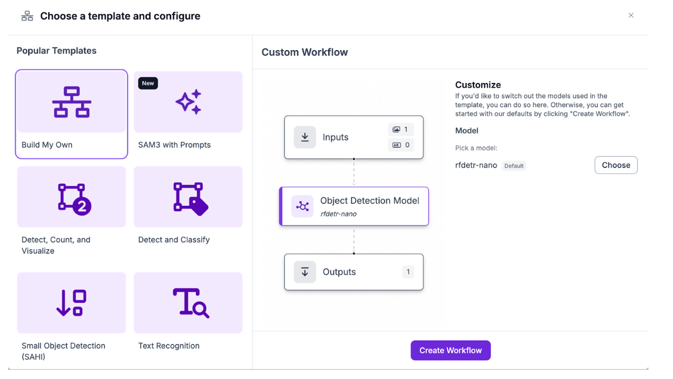 We’ll start by creating a new Workflow (finished version) already. If you haven't already, create a Roboflow account, with an API key, and a new workspace. From there, create a new Workflow with the “Build My Own” template: