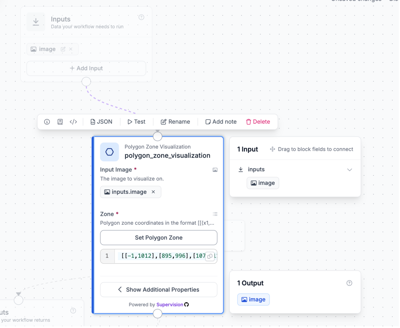 The first thing for conditional annotation is the danger zone that we’re going to be detecting. From the available blocks, choose the polygon zone visualization block. This block won’t be used in the output, but as an intermediate step for getting a polygon reference coordinates for the video you plan to use:
