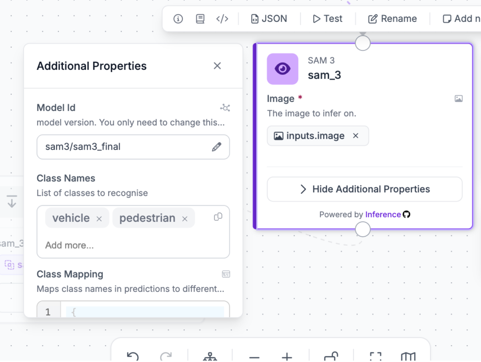 Later on, we’ll refer to these coordinates again. Next, we’ll need to get detections for both vehicles and pedestrians, so connect the SAM 3 block, and add the input image (default):