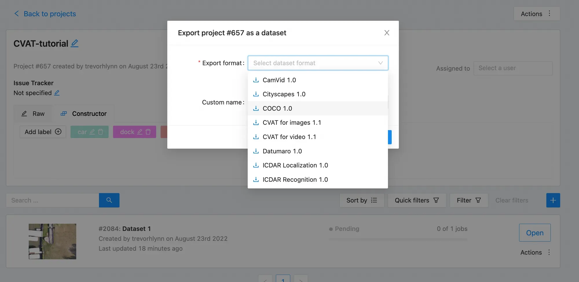 Then you want to click "Export task dataset" and you can choose among different formats: label VOC XML, label COCO JSON, label YOLO annotations, etc. Before exporting, be sure to know the format needed to train your specified model of choice. In the even you need to convert your annotations to a format CVAT does not support, Roboflow offers free dataset conversions to 26+ formats.