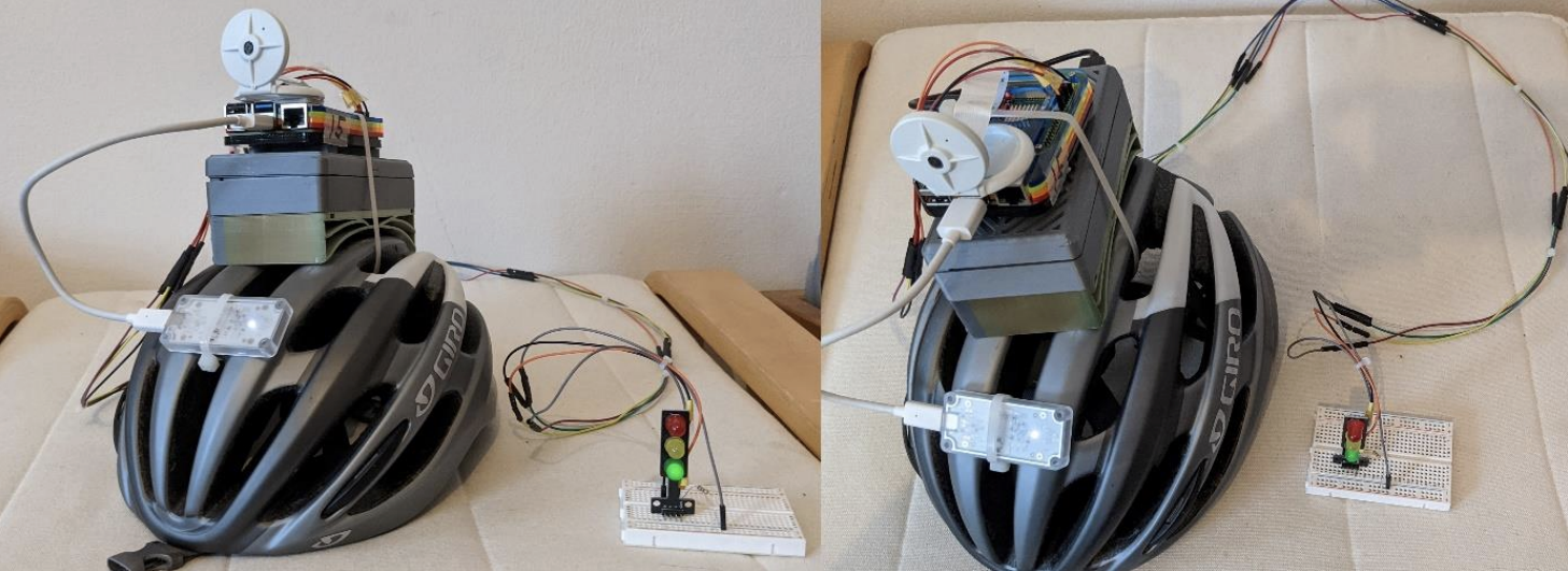 The LED traffic light switched between the colors depending on the risk of the danger. Specifically, the distance, size, and predicted label of each object controlled the LED traffic light logic. (For example, predicting a car that is far away turns the LED light "green," for low-danger, but predicting a car that is closer yields "yellow" for increased danger.)