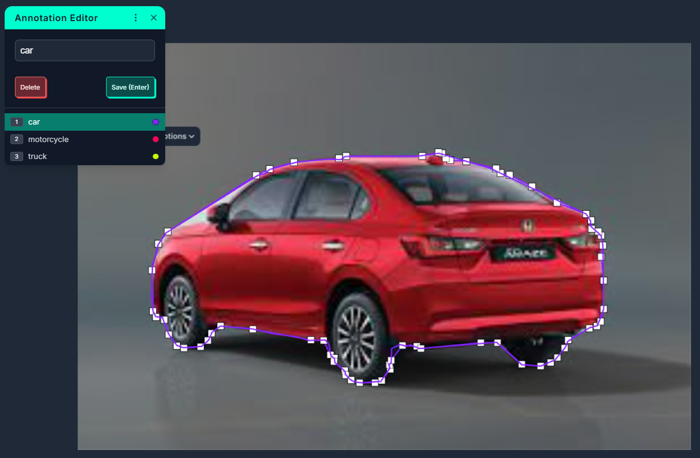 Polygon annotations are made by connecting a series of points to outline the exact shape of an object. Unlike bounding boxes, which are always rectangular, polygons can follow an object’s true contours. Polygons can be used in instance segmentation and semantic segmentation tasks where precise object boundaries are needed. For example, outlining the silhouette of a dog, the exact boundary of a road sign, or the shape of a building’s roof in satellite imagery.