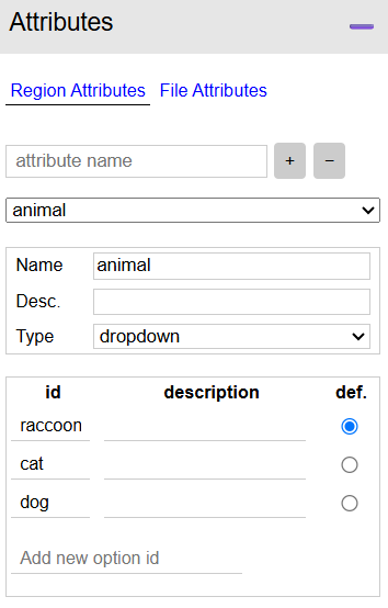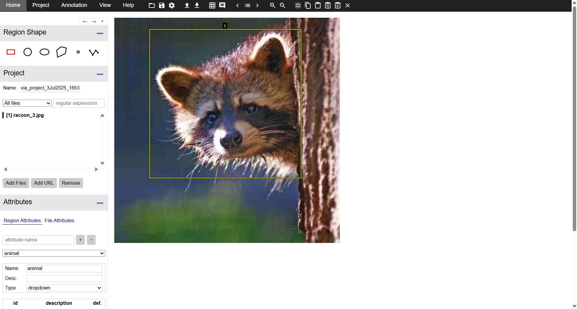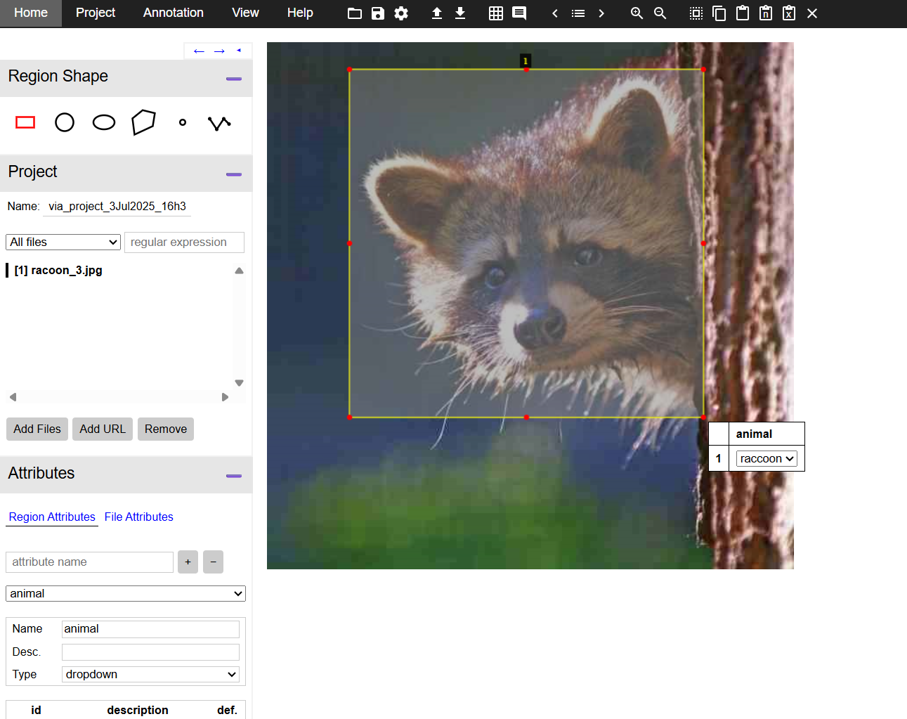 Click Attributes on left pane and create a new region attribute (e.g. "class_label"). Set this attribute as a dropdown menu with your object class names (e.g., “cat”, “dog”, “raccoon”). This enables consistent class selection.