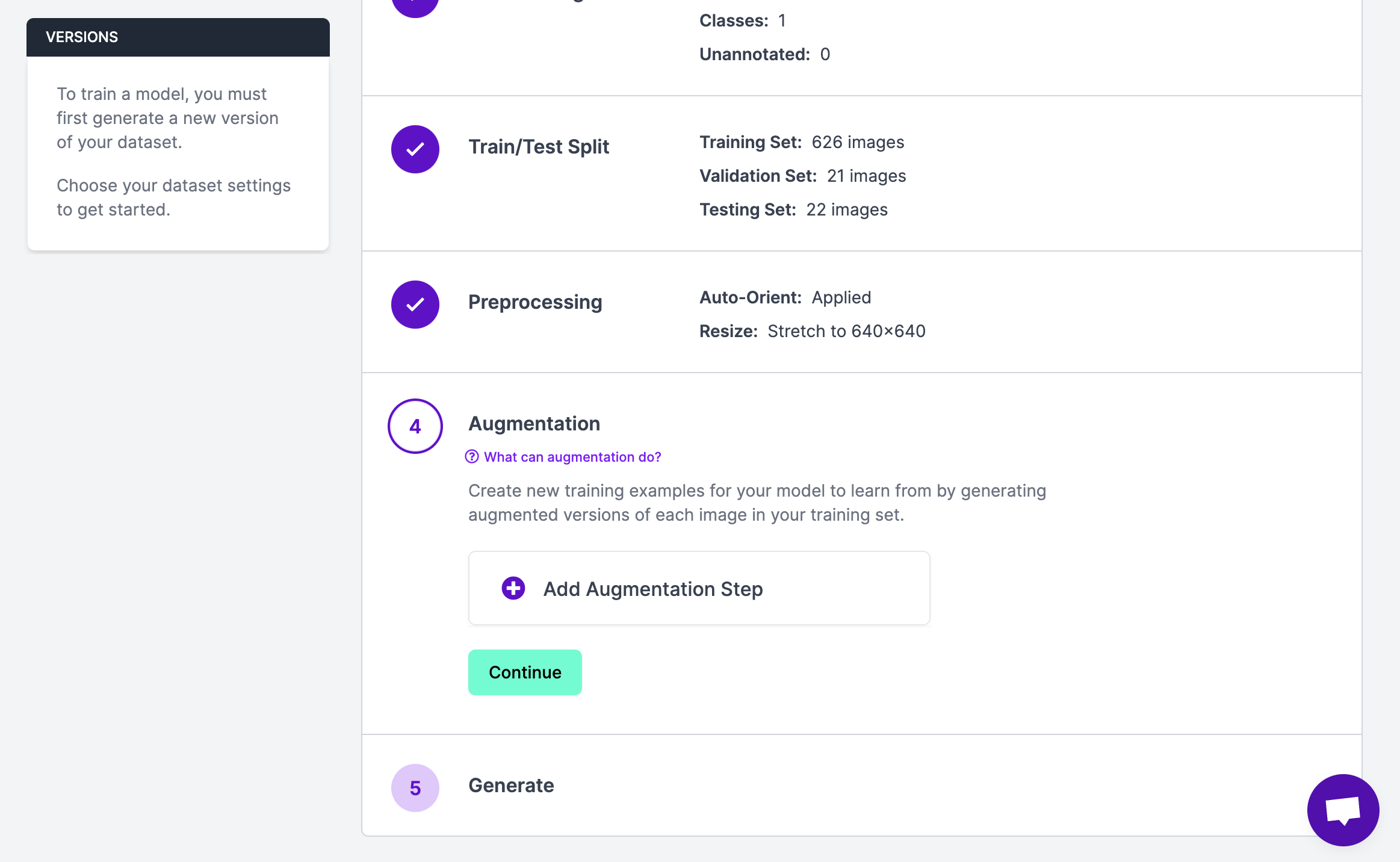 Once you have configured your augmentations, click “Generate” at the bottom of the page. This will generate a version of your dataset. The amount of time it takes to generate your dataset version will vary depending on how many images are in your dataset.