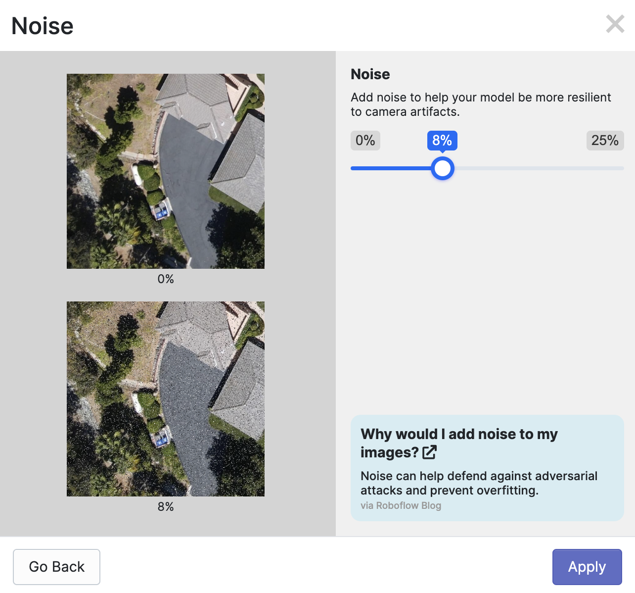 Select the augmentation you want to apply. Then, you will be asked to configure the augmentation, if required. The options available will depend on the augmentation you want to apply. For the noise augmentation, for example, we can control how much noise to introduce into images: