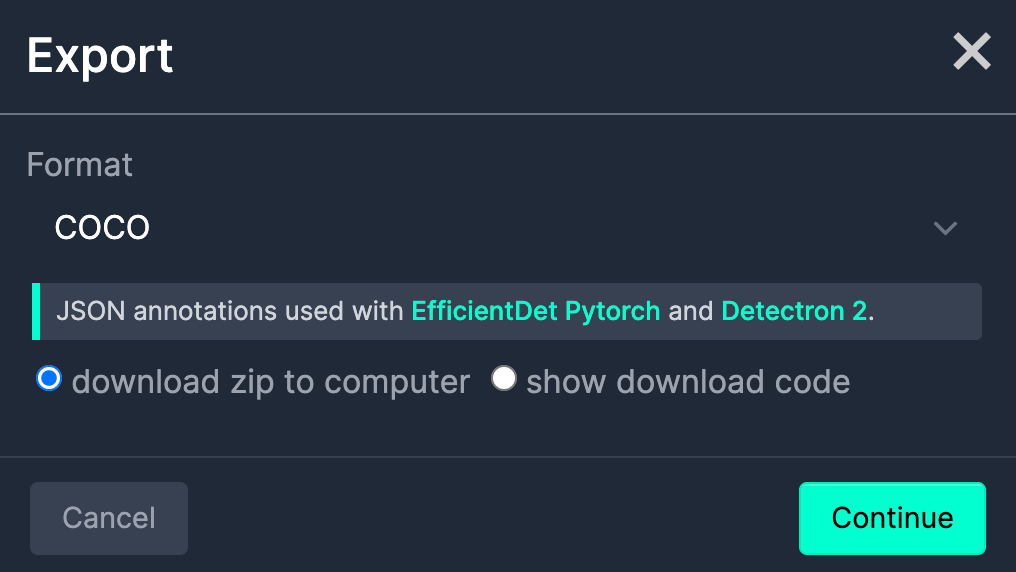 Copy the code snippet provided and use it to download your data for use in your training scripts. We have a repository of over 20 notebooks on GitHub that walk through training computer vision models using common architectures. Check out the guide associated with the model architecture you are using for reference material on how to work with the Roboflow API in your training process.