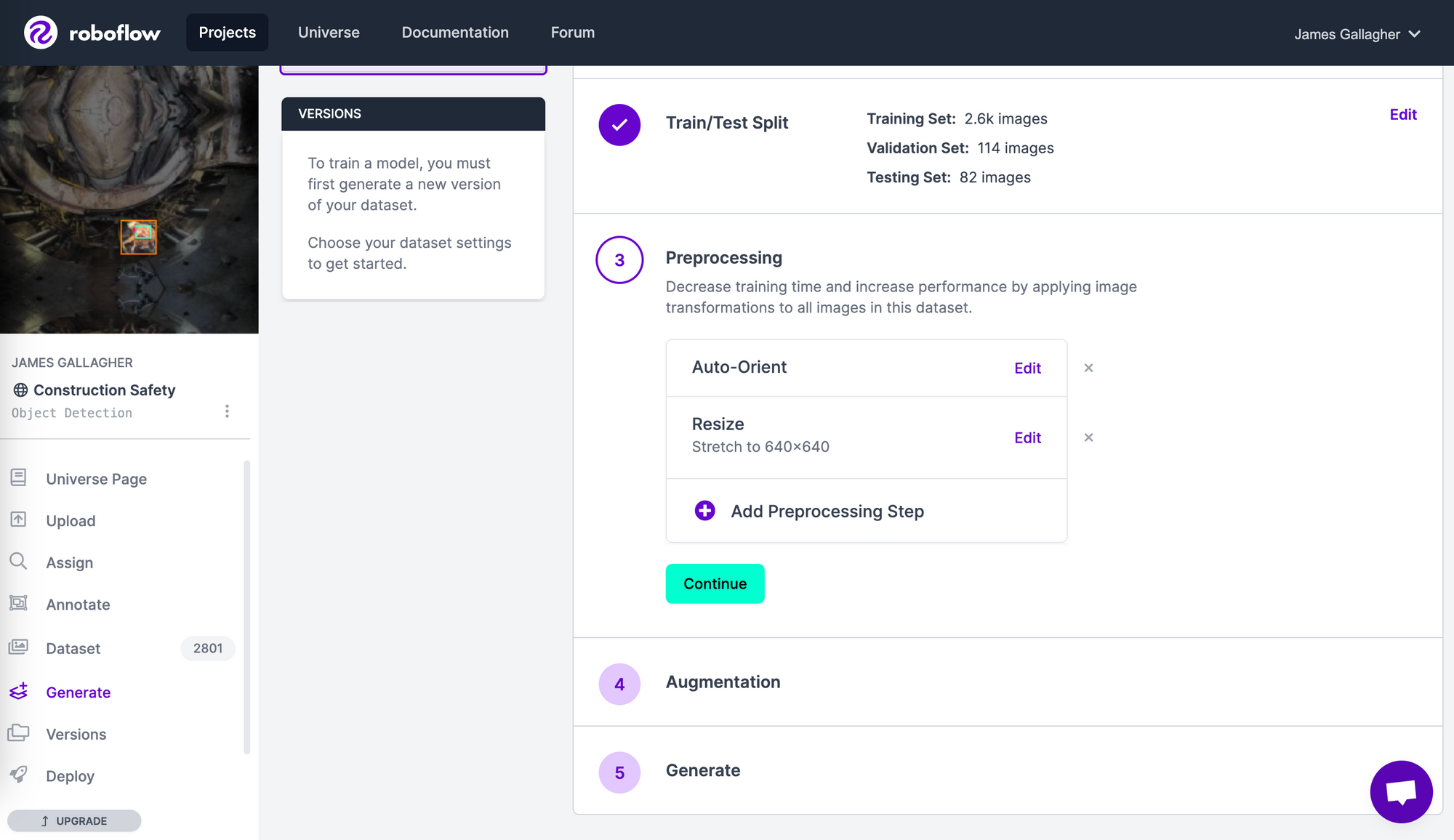 On this page, you will be asked whether you want to add any preprocessing steps to images in your dataset or generate augmented images. By default, a few preprocessing steps will appear on the page. We recommend leaving these steps as they are unless you need to apply other preprocessing steps. The two defaults -- auto-orient and resizing images -- boost model performance.