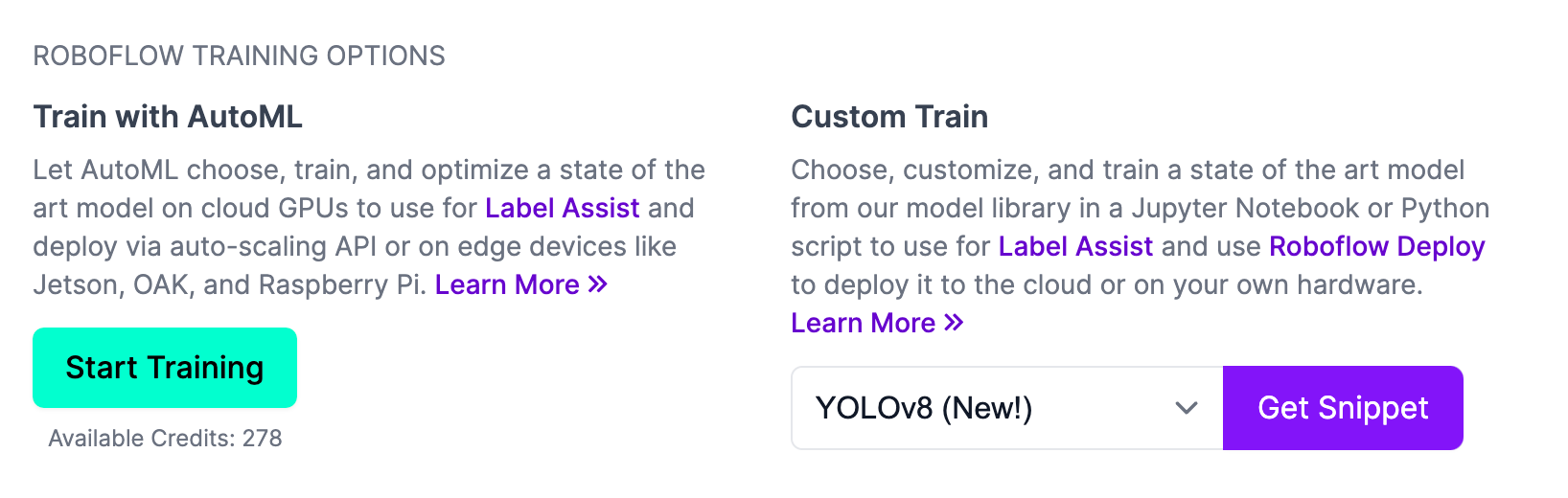 After your new dataset is ready, export your data from Roboflow. In the “Custom Train & Deploy” section of the dataset version page, select the model you are going to use in training. You will only see the models that fit your project type.