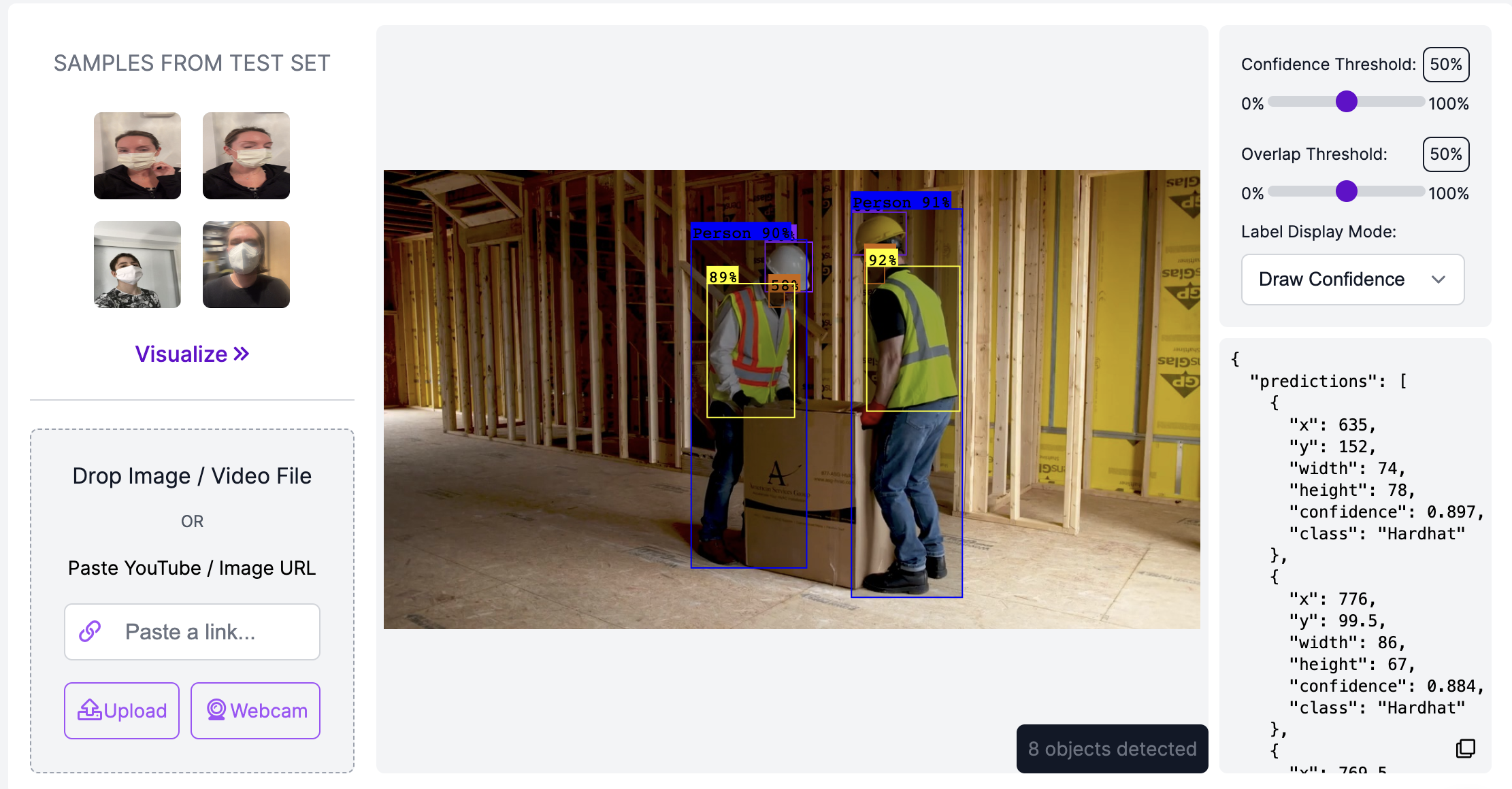 You can test your model in your browser. Navigate to the “Deploy” tab in the Roboflow dashboard. In this tab, you can test your model by uploading images and videos, using images from your test set, pasting in URLs to images and YouTube videos, or by using your webcam: