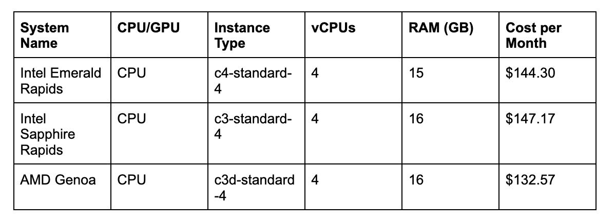 We benchmarked Florence-2 on Intel Emerald Rapids and Intel Sapphire Rapids systems on Google Cloud Platform to analyze performance improvements between the generations of CPUs. We also benchmarked performance on AMD’s Genoa architecture.