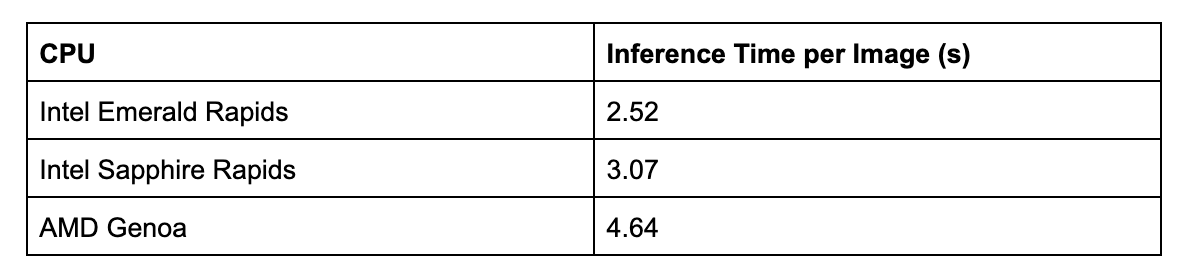 Intel Emerald Rapids achieves the lowest inference time per image out of all CPU architectures we tested, followed by Intel Sapphire Rapids. Intel Emerald Rapids, on average, processes images 0.55s faster than the previous generation Sapphire Rapids CPU system.