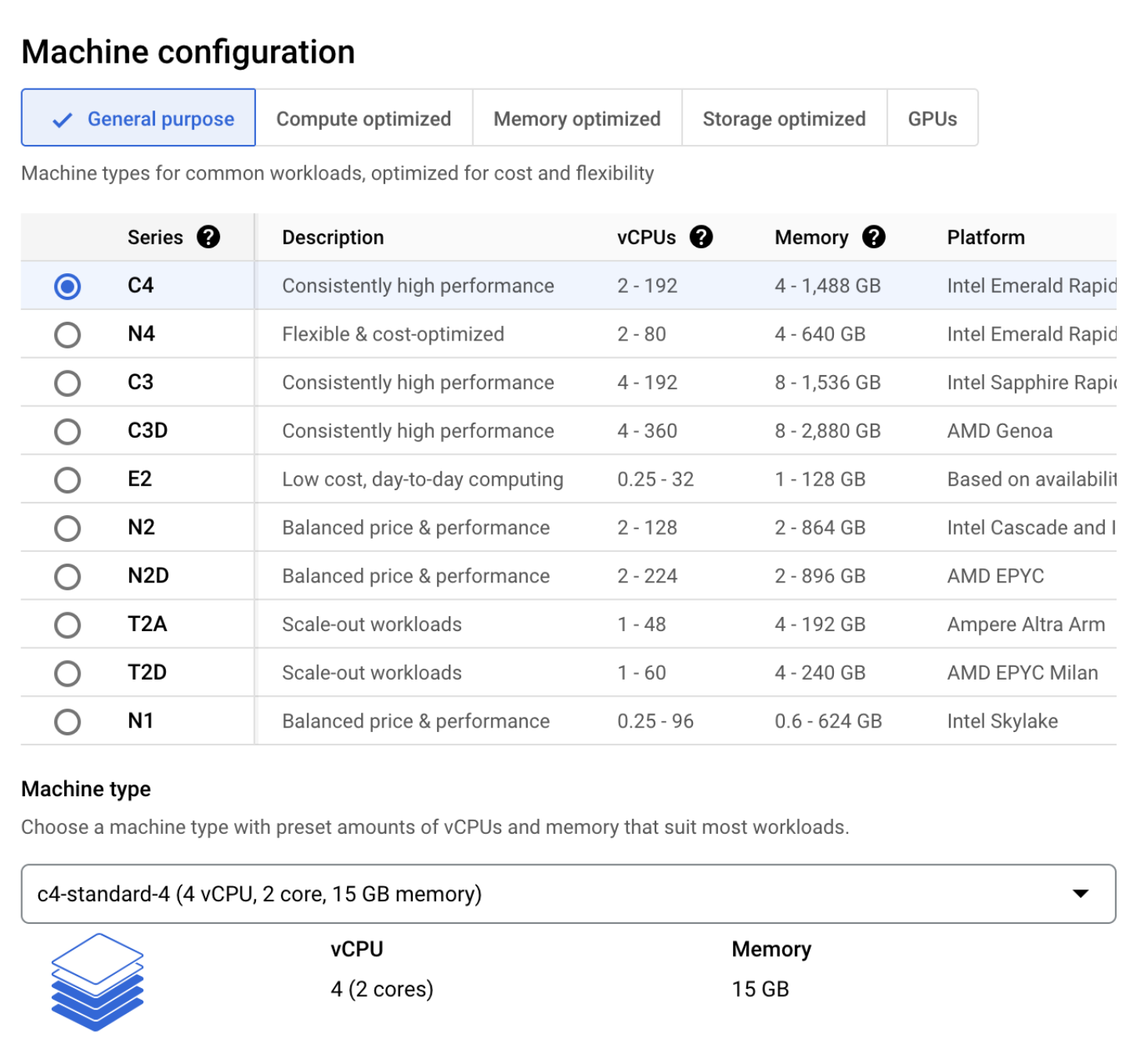 We will create a c4-standard-4 instance with 4 vCPUs, 2 cores, and 15 GB of memory.