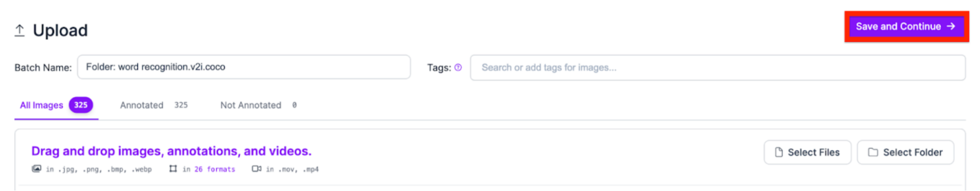 You can upload annotated or raw computer vision data in over a dozen supported formats. See our list of supported upload formats.