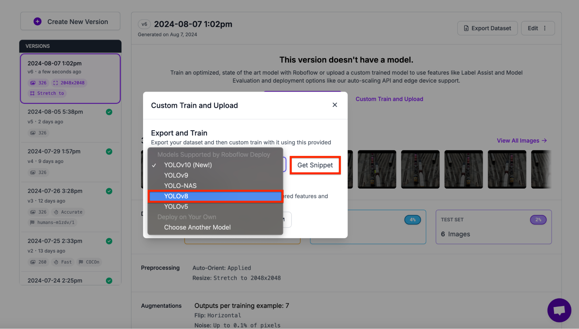 Next, select the type of data you want. Every model is trained on different data types. Therefore, we need to specify which type of data we need. In our case, we need YOLOv8. After selecting YOLOv8, click get snippet.
