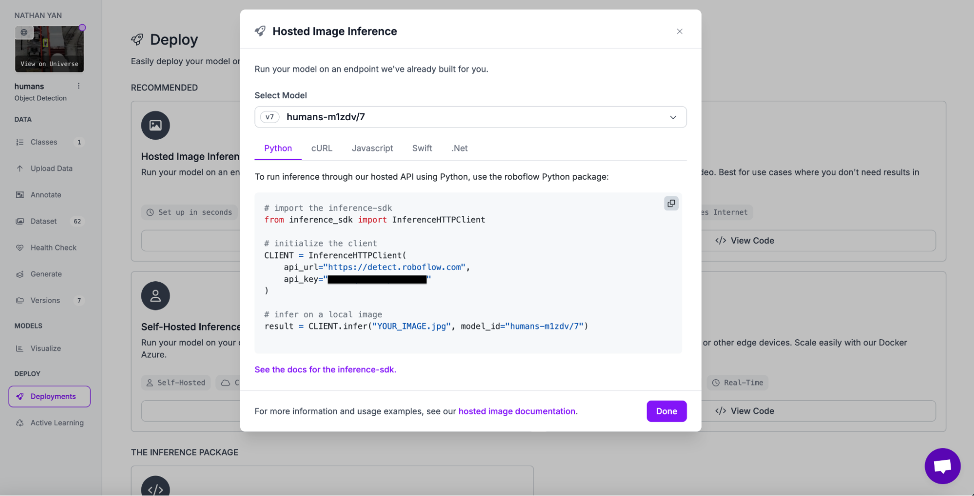 To deploy the model using code, go to the deployment page in your dashboard and deploy the model with inference.