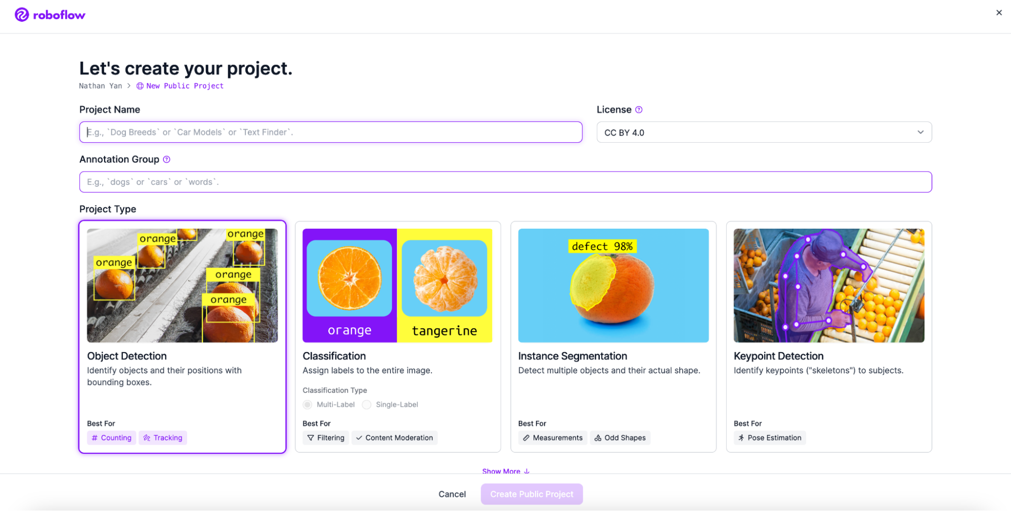 Go to Workspaces and create a Project. Customize the project name and annotation group to your choice. Make sure to create an object detection project if you want to follow this guide.
