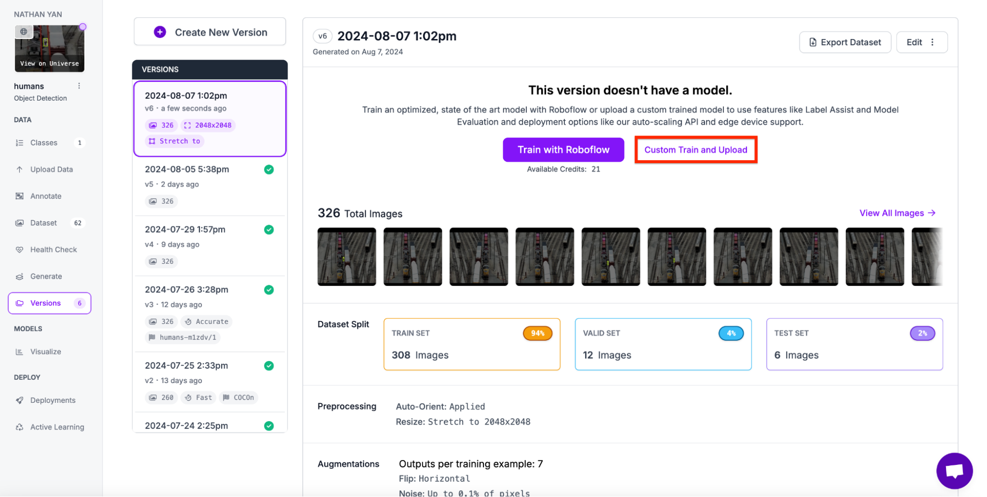 Now that we have our annotations and images, we can generate a dataset version of your labeled images. Each version is unique and associated with a trained model so you can iterate on augmentation and data experiments.