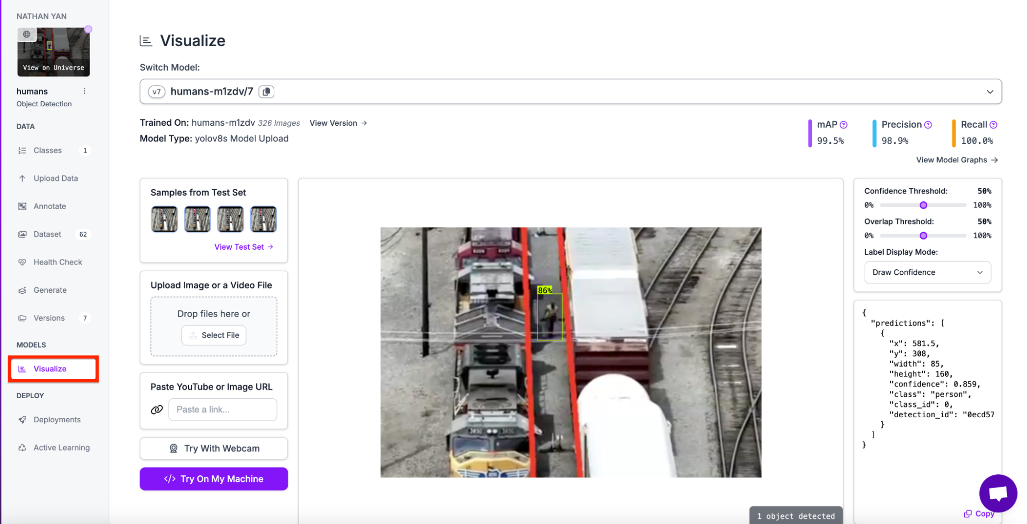 When your model is ready, you will see an interactive Visualize page in the Roboflow dashboard from which you can test your model. To navigate to the page, click on visualize on your dashboard.