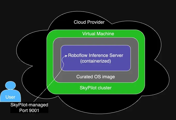 The inference CLI invokes SkyPilot to launch a GPU VM and install the appropriate Roboflow inference server docker containers and configure the firewall/port (9001).
